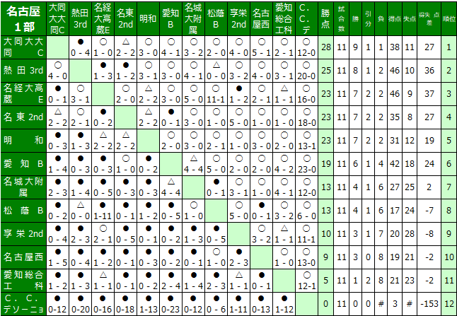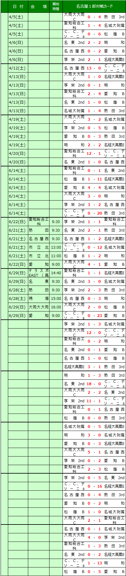 愛知県高校サッカー名古屋地区リーグの結果を送信ください。