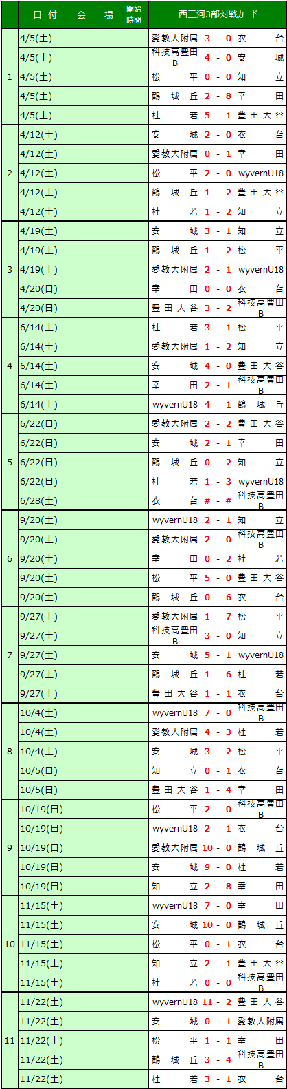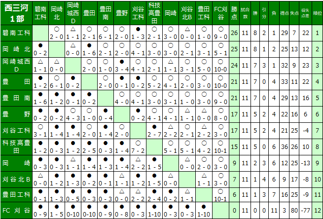 愛知県高校サッカー西三河地区リーグの結果を送信ください。