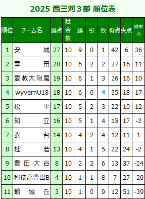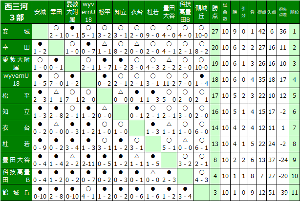 愛知県高校サッカー西三河地区リーグの結果を送信ください。
