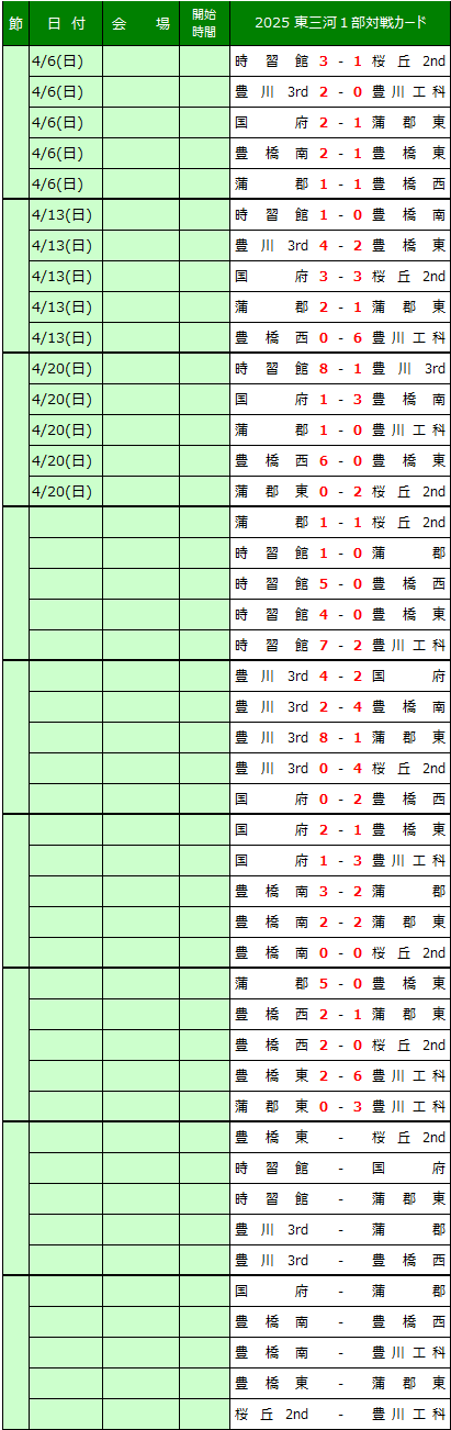 愛知県高校サッカー東三河地区リーグの結果を送信ください。