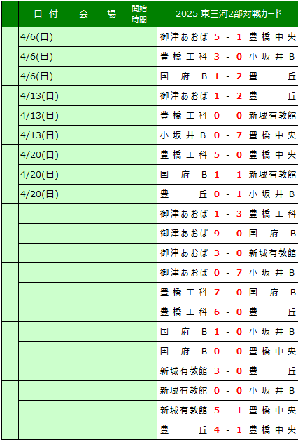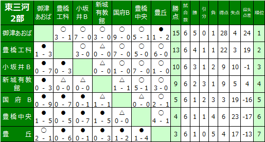愛知県高校サッカー東三河地区リーグの結果を送信ください。
